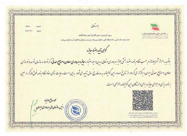 صدور گواهی اعتبار پنجساله جایزه بهرهوری معادن و صنایع معدنی ایران